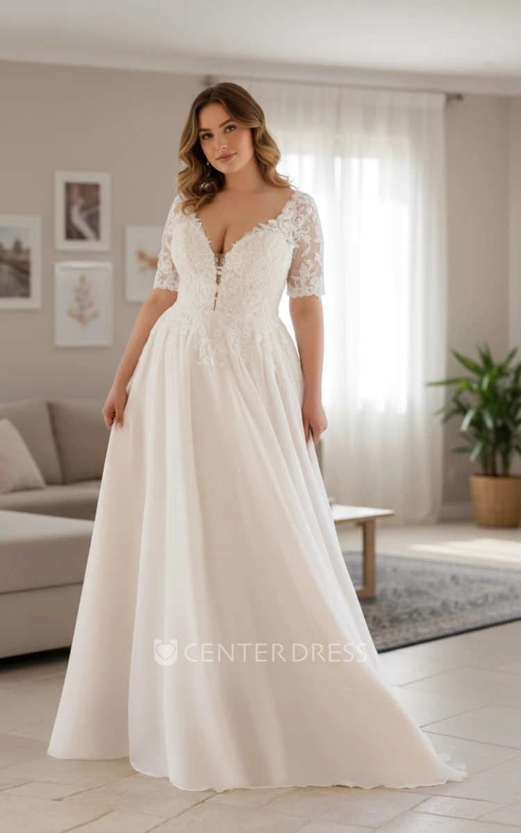 A-line Plus Size Deep V-Neck Lace Bridal Gown Elegant Half Sleeves Flowy Chiffon Bridal Gown