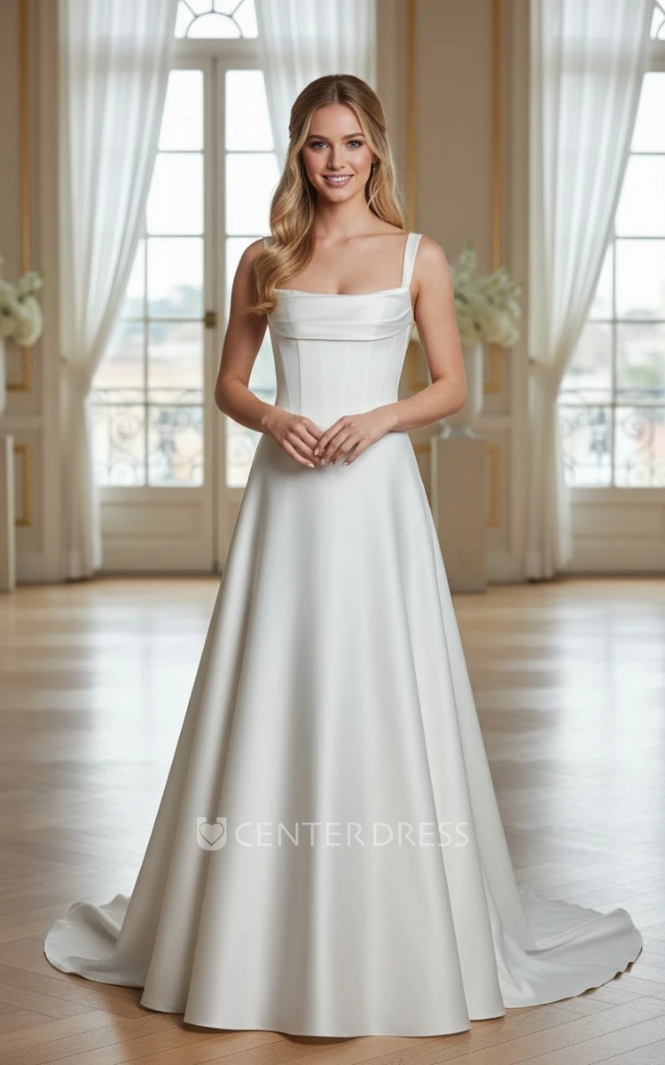 Elegant Modern A-Line Satin Square Neckline Spring Wedding Dress Flowy Simple Boned Bodice Wide Strap Backless Bridal Gown with Train