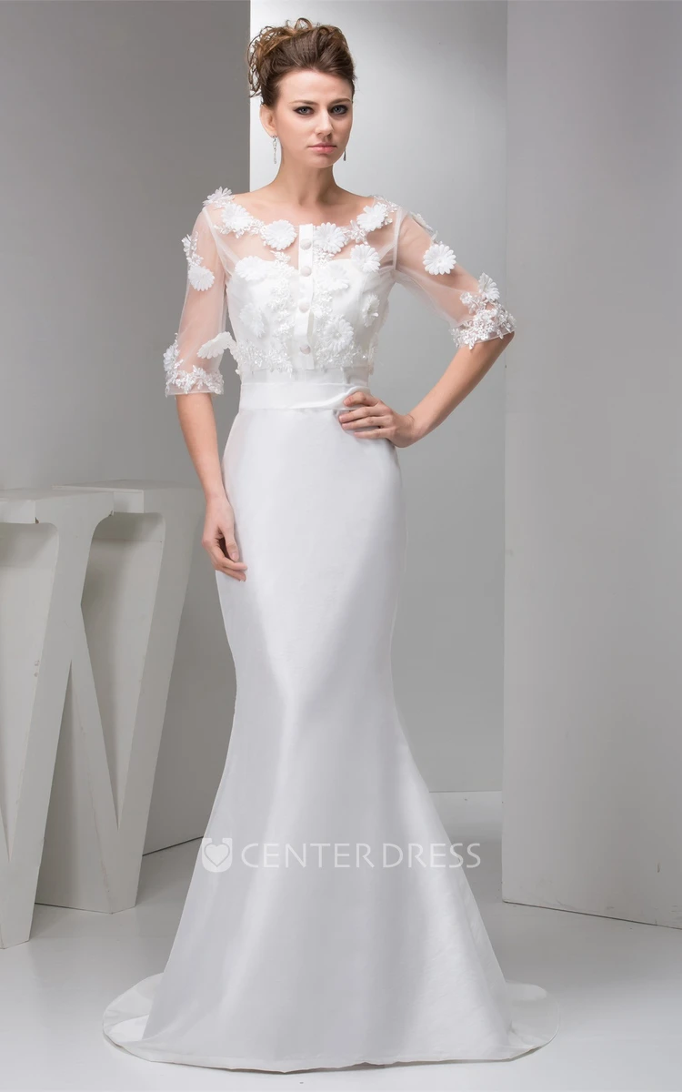 Floral Half-Sleeve Satin Mermaid Dress with Illusion Top
