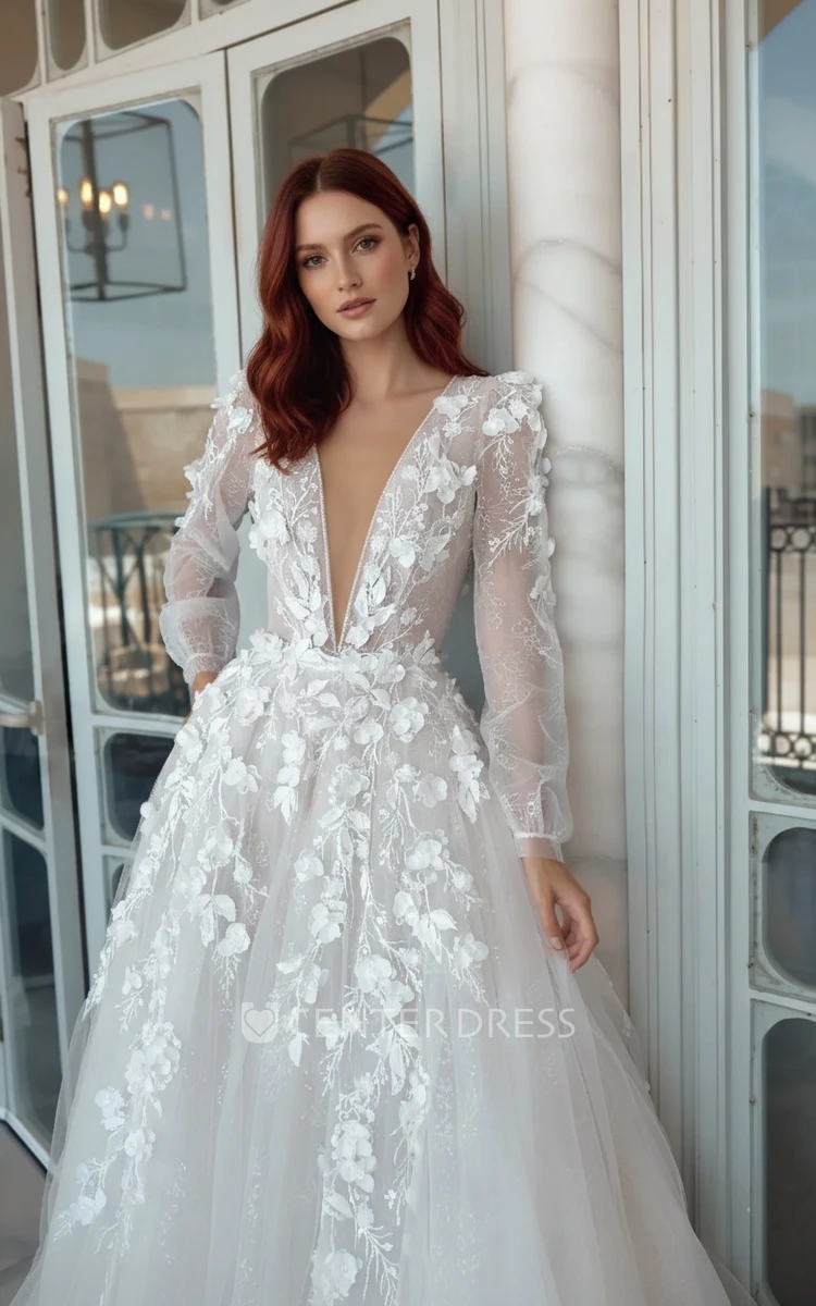 Graceful Elegant A-Line Lace Long Sleeve Spring Wedding Dress with Long Train Ethereal Princess Plunging Neckline Garden Bridal Gown