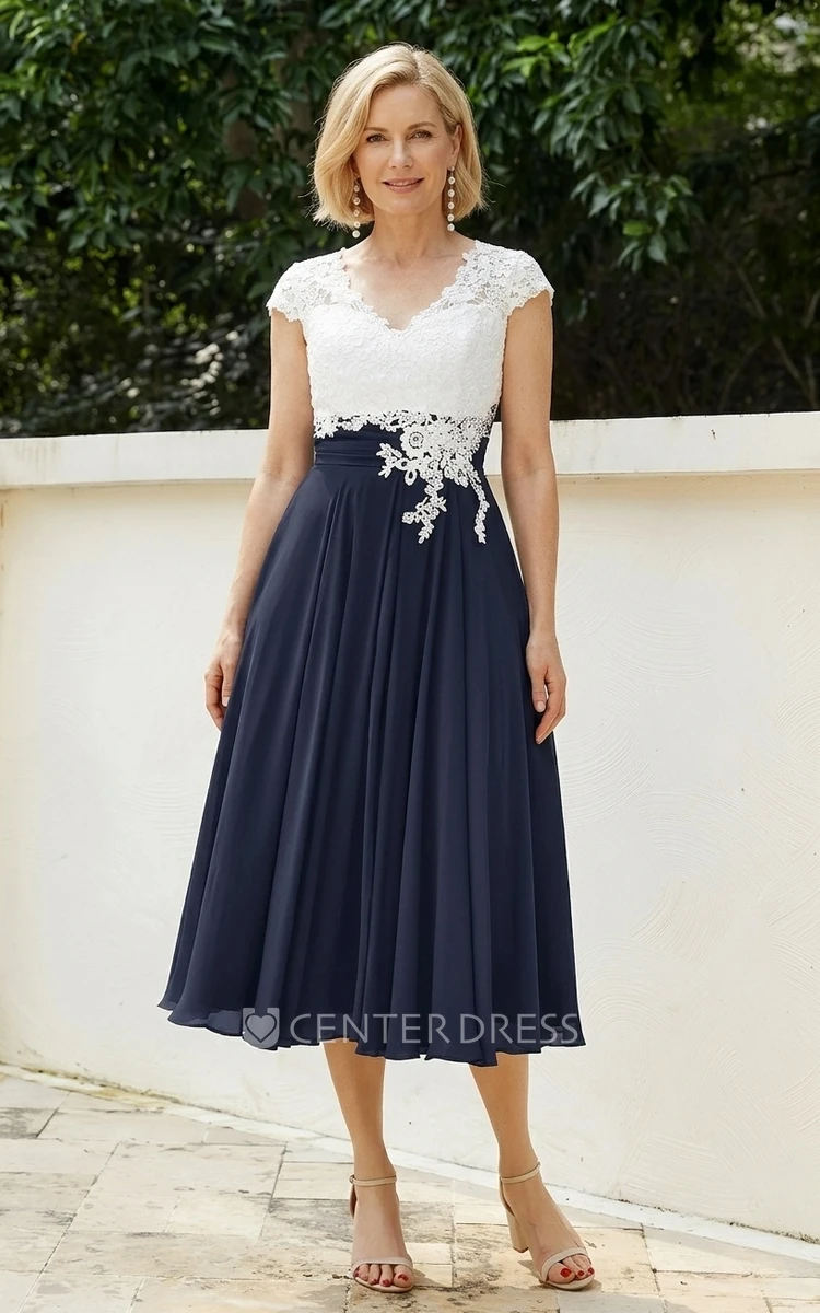 Lace Appliques Chiffon A-Line V-neck Petite Tea-length Sexy Elegant Short Cap Sleeve Mother of the Bride Guest Dress