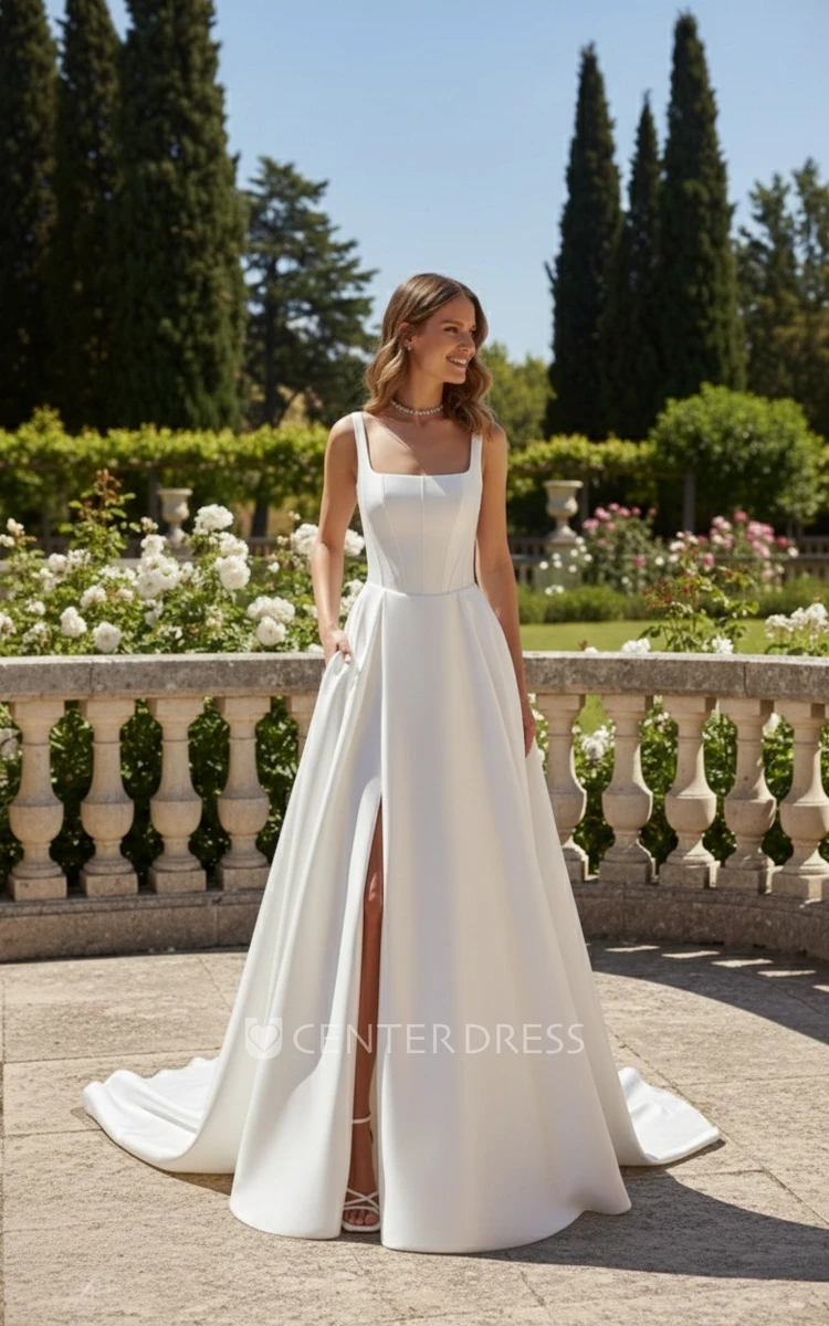 Minimalist Casual A-Line Square Neck Spring Wedding Dress Simple Romantic Pleated Side Slit Low Back Court Train Bridal Gown